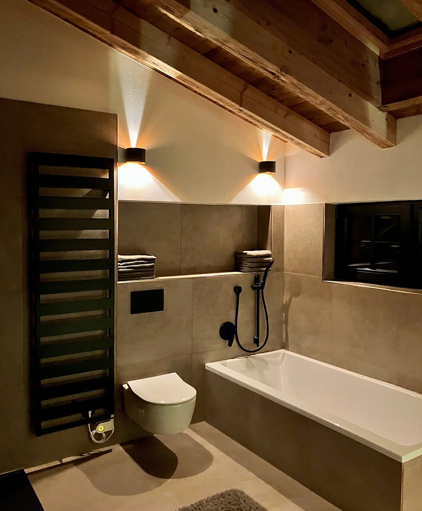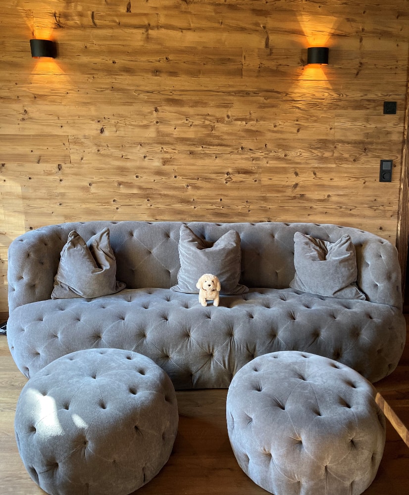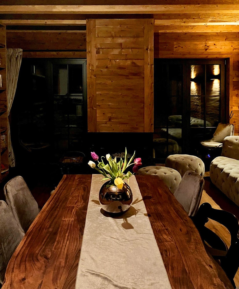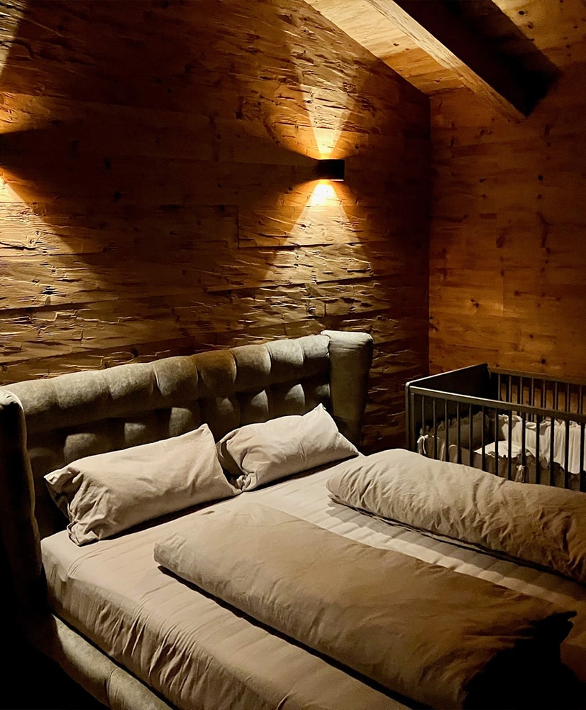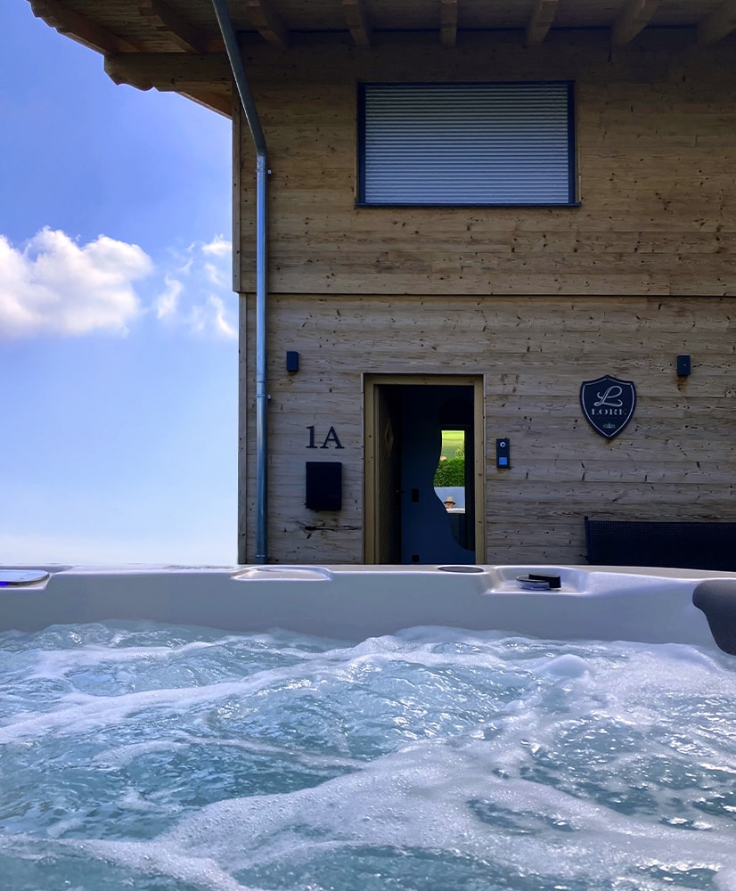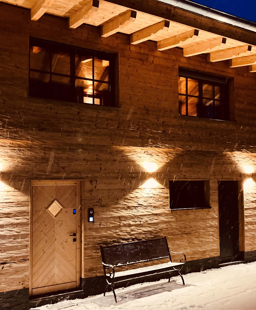 Das Interieur aus warmem Holz, sanftem Licht und hochwertigen Lampen schafft eine Atmosphäre zum Wohlfühlen – elegant, gemütlich und authentisch. Genießen Sie den offenen Kamin mit Holzumrandung, die Infrarotsauna mit Lichteffekten oder den beheizten Whirlpool unter freiem Himmel.
